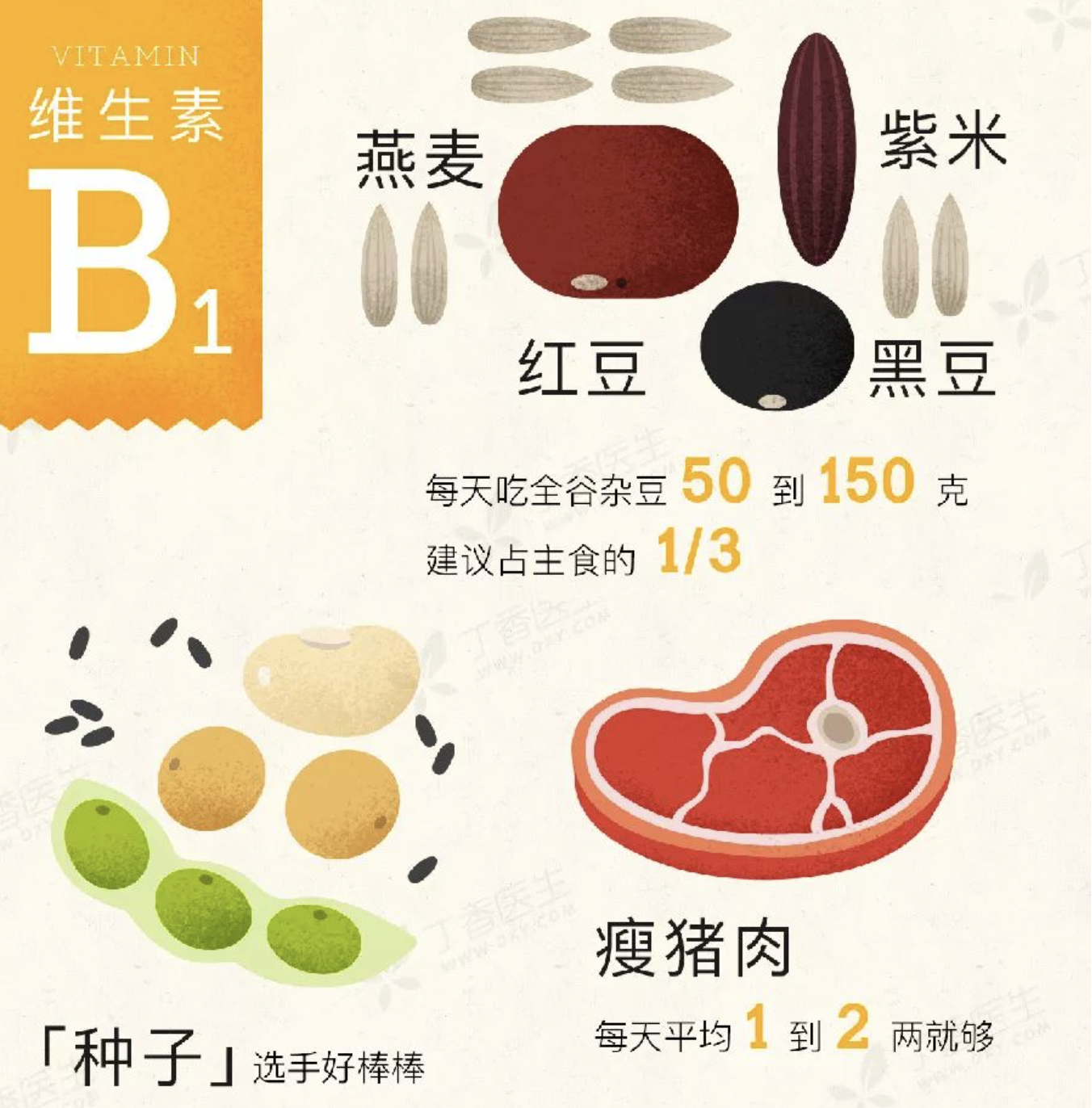 维生素B1,又称硫胺素,维生素B1主要负责调节神经组织的各种活动,它的缺乏会引起注意力不集中、记忆力衰退及抑郁等问 题,非真菌感染型的脚气病也与它有关。